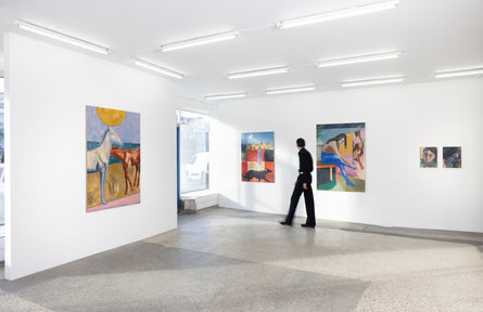 In three smaller interior paintings, Kohlmann's figures peer out from their cells. The figures’ solitude stems not only from the confines of the frame, or the frames within the frame, the windows, or the color fields, which the figures bend and adjust to – typical of Kohlmann’s works – but also from being trapped in one’s own being. With her palette of burnt oranges, chartreuse greens, blushy reds, midnight blues, dusty pinks and purples, Kohlmann herself has described the interior paintings as color samples, a desire to set the right mood or intention, but she rarely lets go of figuration. In these paintings, where outer landscapes meet inner, the figures blend into their surroundings. Kohlmann’s symbolism moves seamlessly between the literal and the metaphorical, the dream and the world as we know it. In the painting Found my Shadow Self Reaching over Me (2021), a figure reaches its arm above its head, the shadow self comically literalized as the arm of the figure. To stress its immaterial nature, Kohlmann runs the blue color of the skies right through the energetic head figure, welcomed by three winged creatures who are just as substantial, just as "real," as the figure.