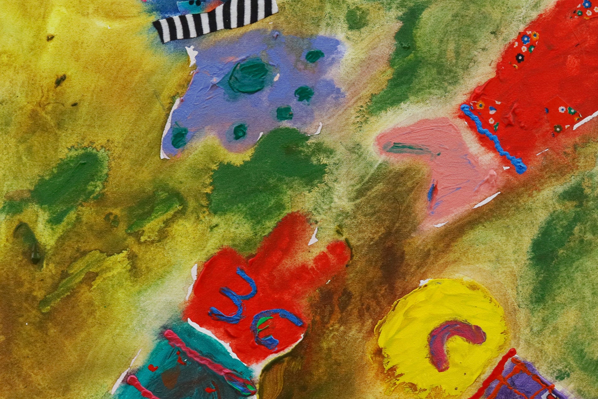 Four furry hands meet in a lively game of rock-paper-scissors. True to Kawai’s practice, the work balances humor and tenderness and the magic in small intimate moments. The glued on cut-out fabric details and irregular textures heighten the sense of spontaneity, as if the work were assembled in the same quick intuitive manner as the game itself.