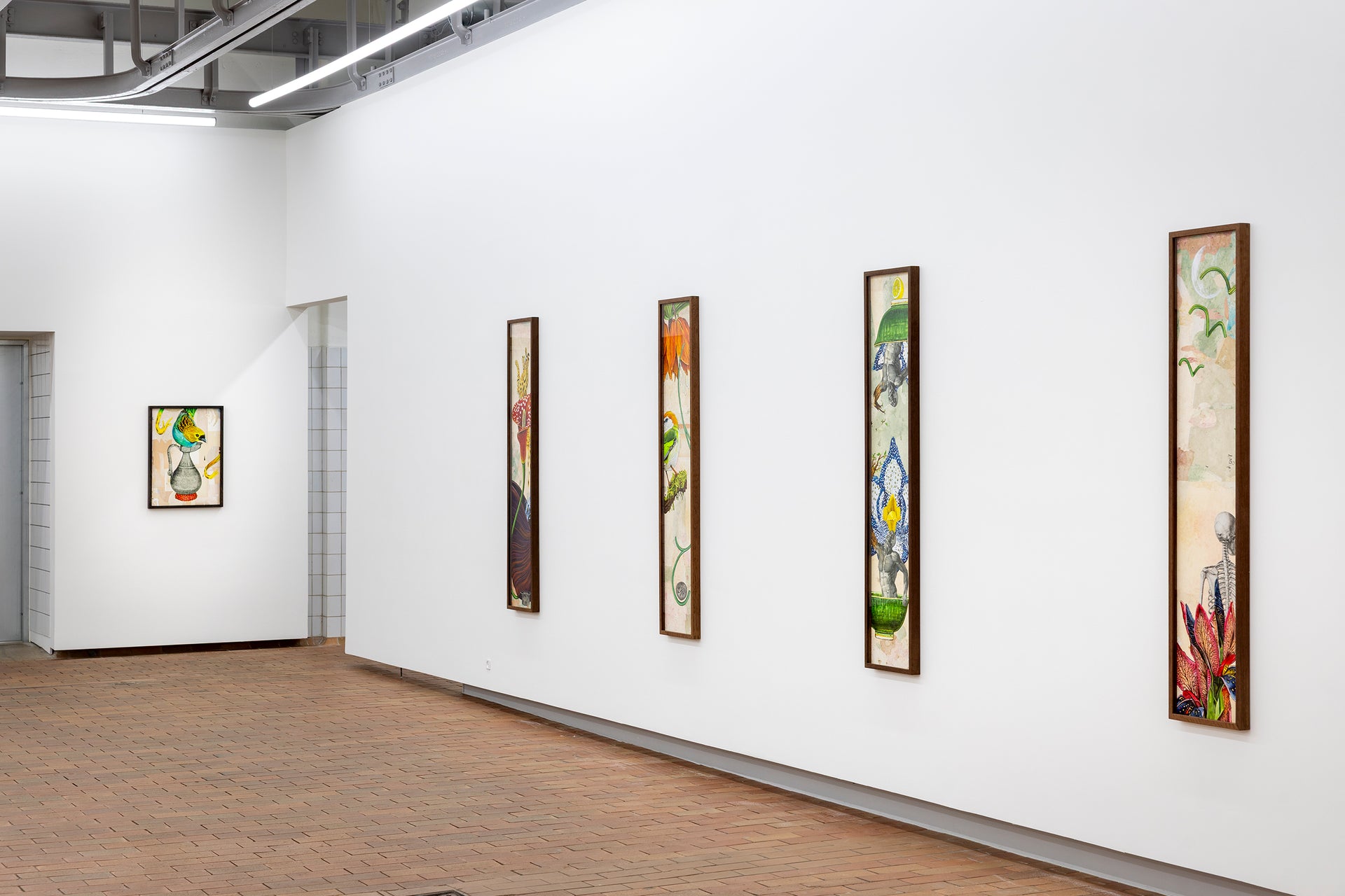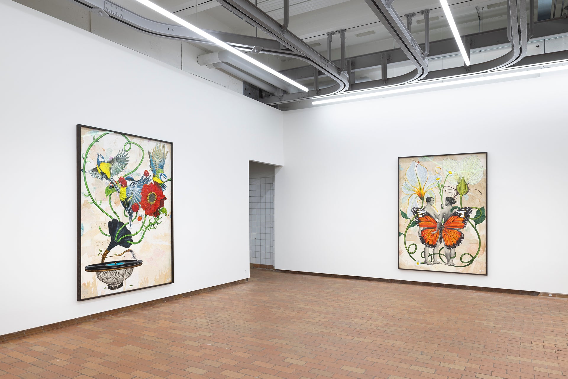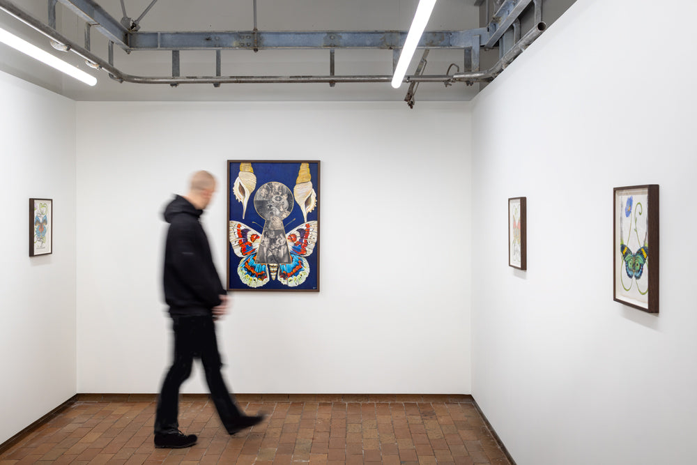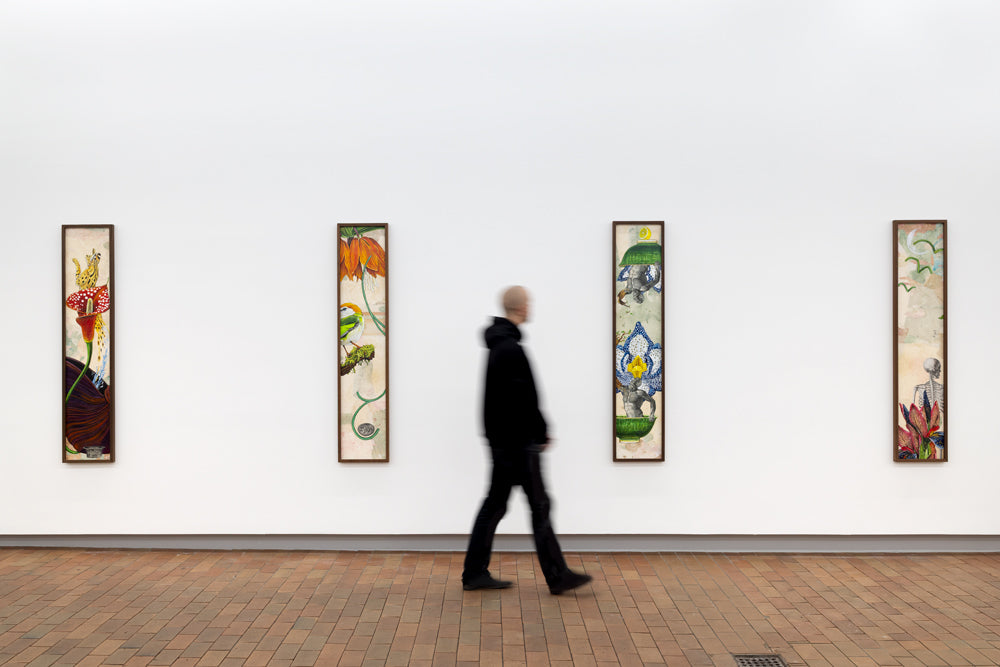 In Troels Carlsen’s exhibition Alt flyder – Everything flows – nothing is permanent, and everything is connected. Flora and fauna are quite literally intertwined in Carlsen’s large tableaus, often painted with acrylics on intricately collaged archival material sourced from antiquarian bookstores.