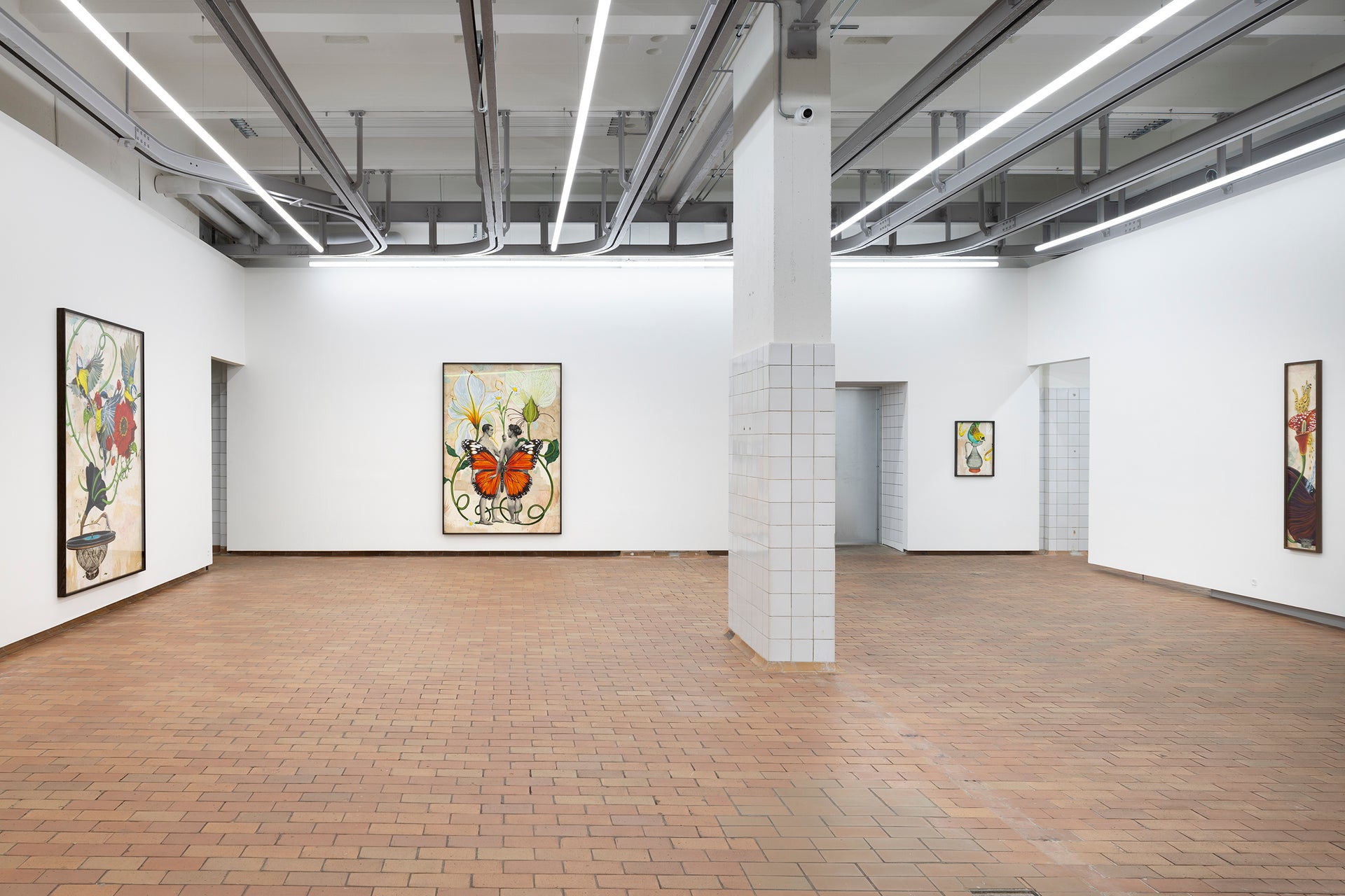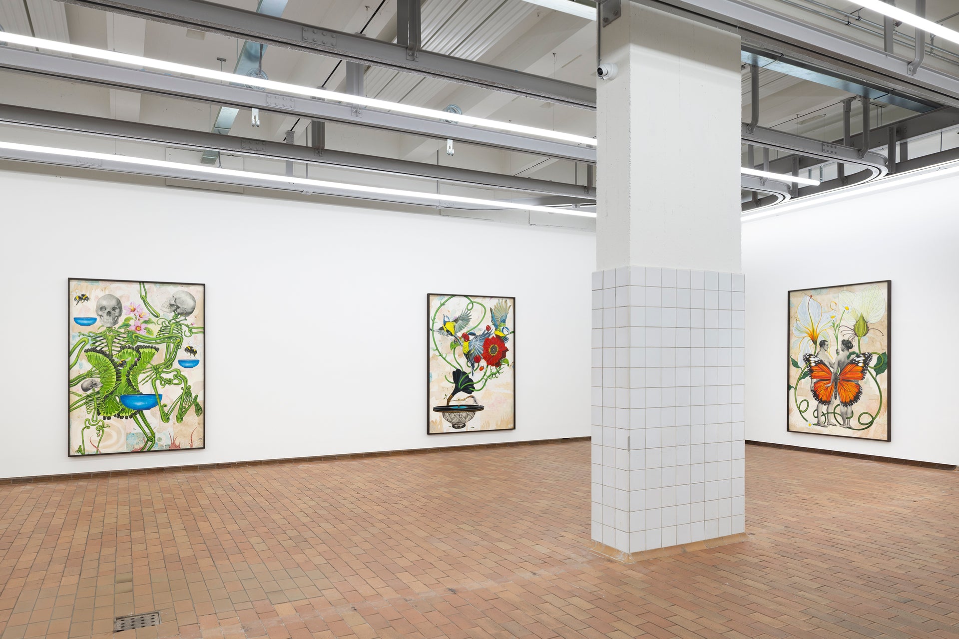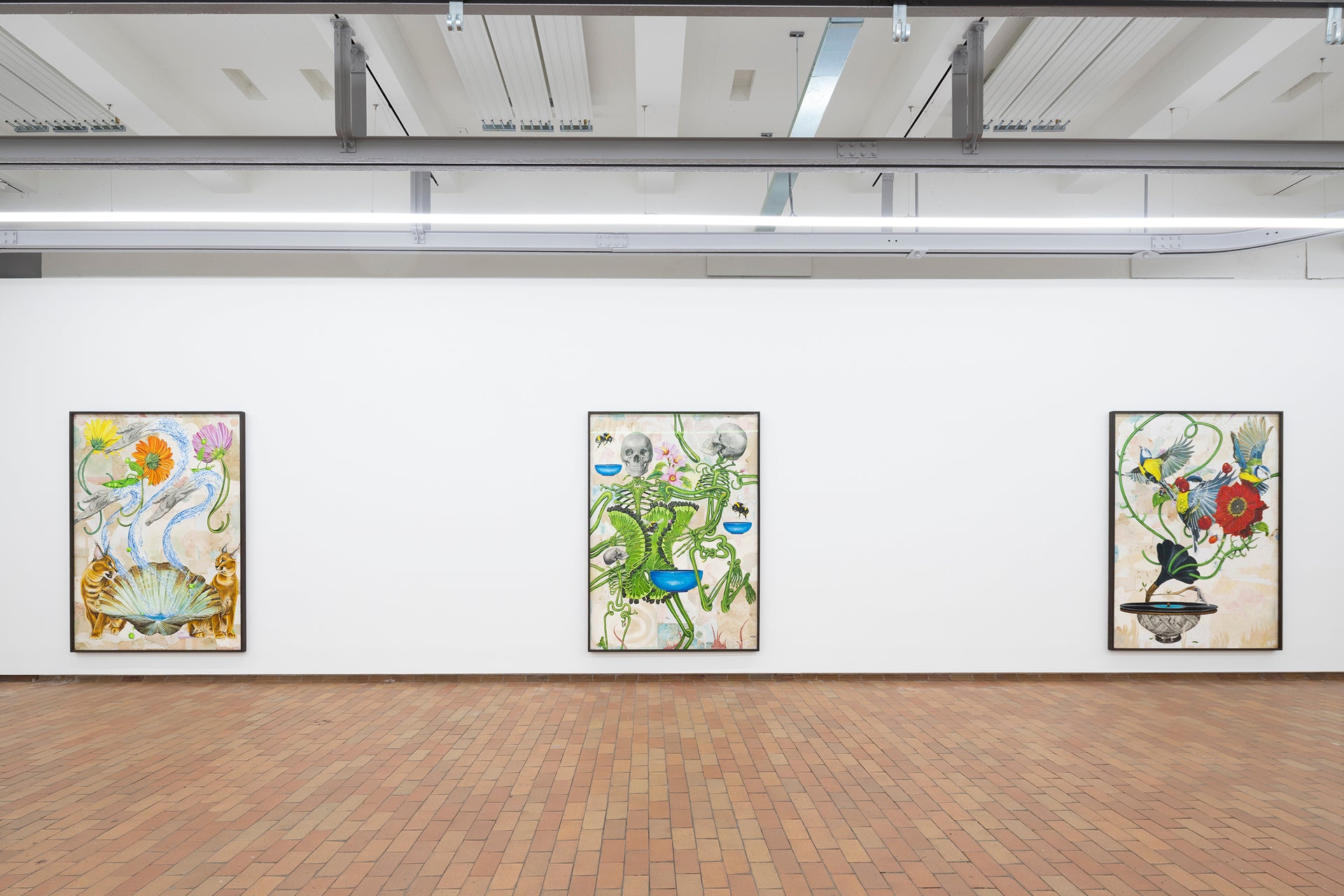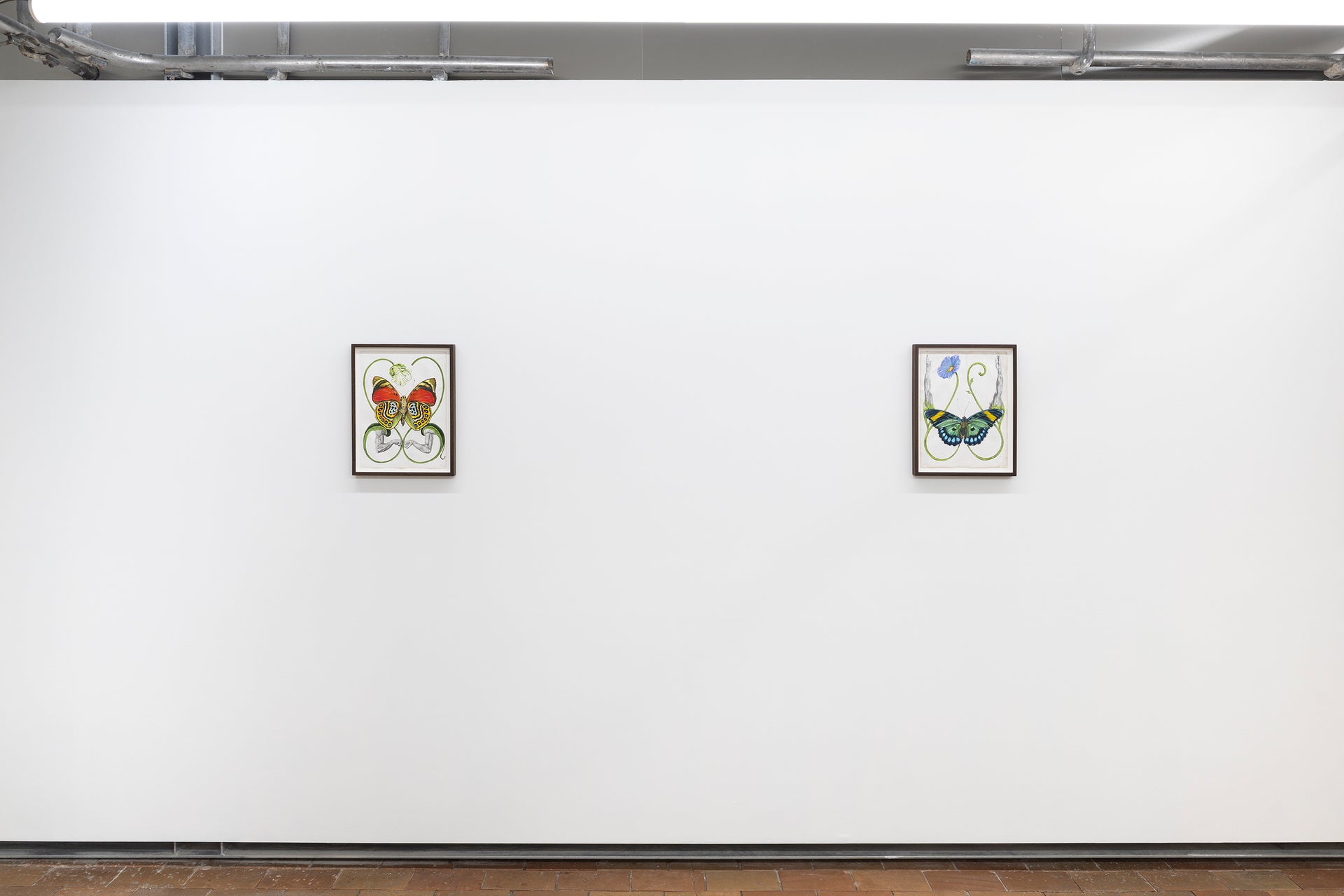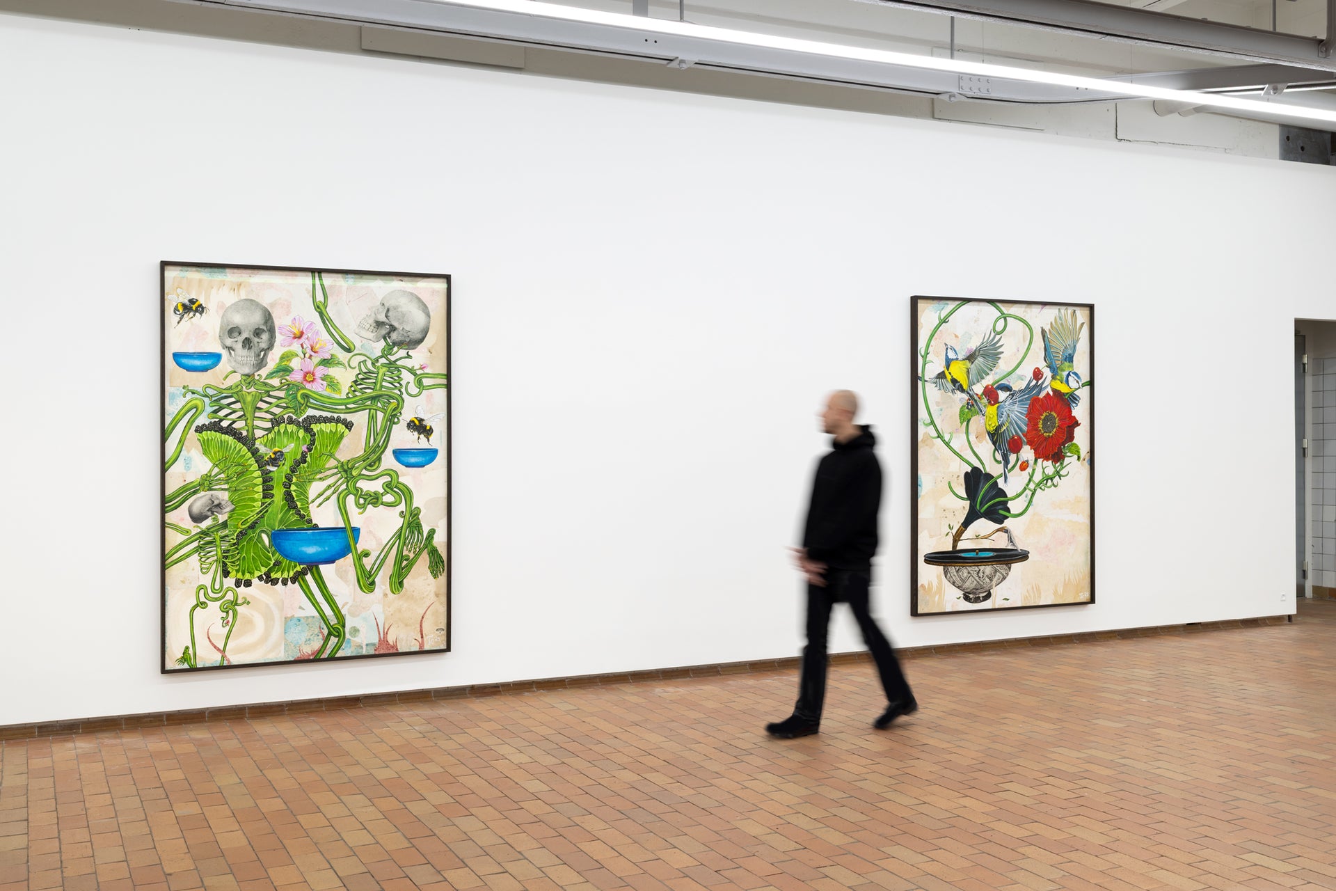 Dynamic, dancing skeletons with bodies of radiant green springy stems and lush leaves sprout blackberries and pink wildflowers, surrounded by bumblebees. Bodies, bees, flowers and fruit are interdependent in an ancient biological choreography. There is a current of freedom flowing through the works. Birds, flowers, ladybirds and butterflies are harbingers of transformation. The compositions are in flux. In one work, an eminent butterfly overshadows a human couple in the composition, while two blooming flowers rise above like floral fireworks. A subtle visual correction to our classic anthropocentric understanding. In Carlsen’s work we are not merely co-dependent on the surrounding world; we are the same – we are change.