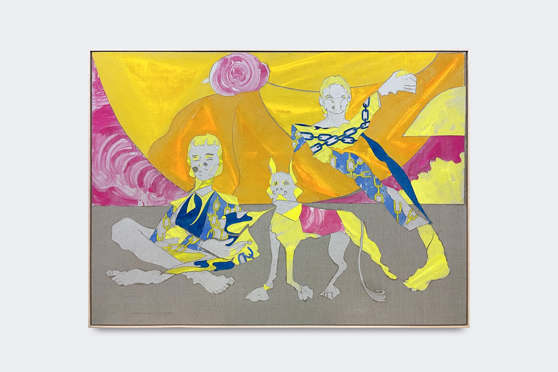 That hustle, that democratic dance, that parade which the works of Kaspar Oppen Samuelsen constituted the theater is affected by a gentle and slow metamorphosis. The boundary between the dynamic surfaces resulting from an initial disintegration of the drawing, followed by a fleeting coloring as well as an arbitrary and abstract reassembly and the most delicate line that caresses idyllic scenes, seems to become impalpable and silky. Everything is hinted at and at the same time full of its identity and the rhythm becomes cadenced and enthralling like that of a Bolero. The tree is yellow, burnt by its sun and its leaves are lost on the canvas as if the essence had already been given away by the stroke; the animal is spotted and amused; the woman is lying and vacillating—her breast harmonious; the flower kisses the cloud; the branch is the color of the sky; a child merges with a ball and crab.