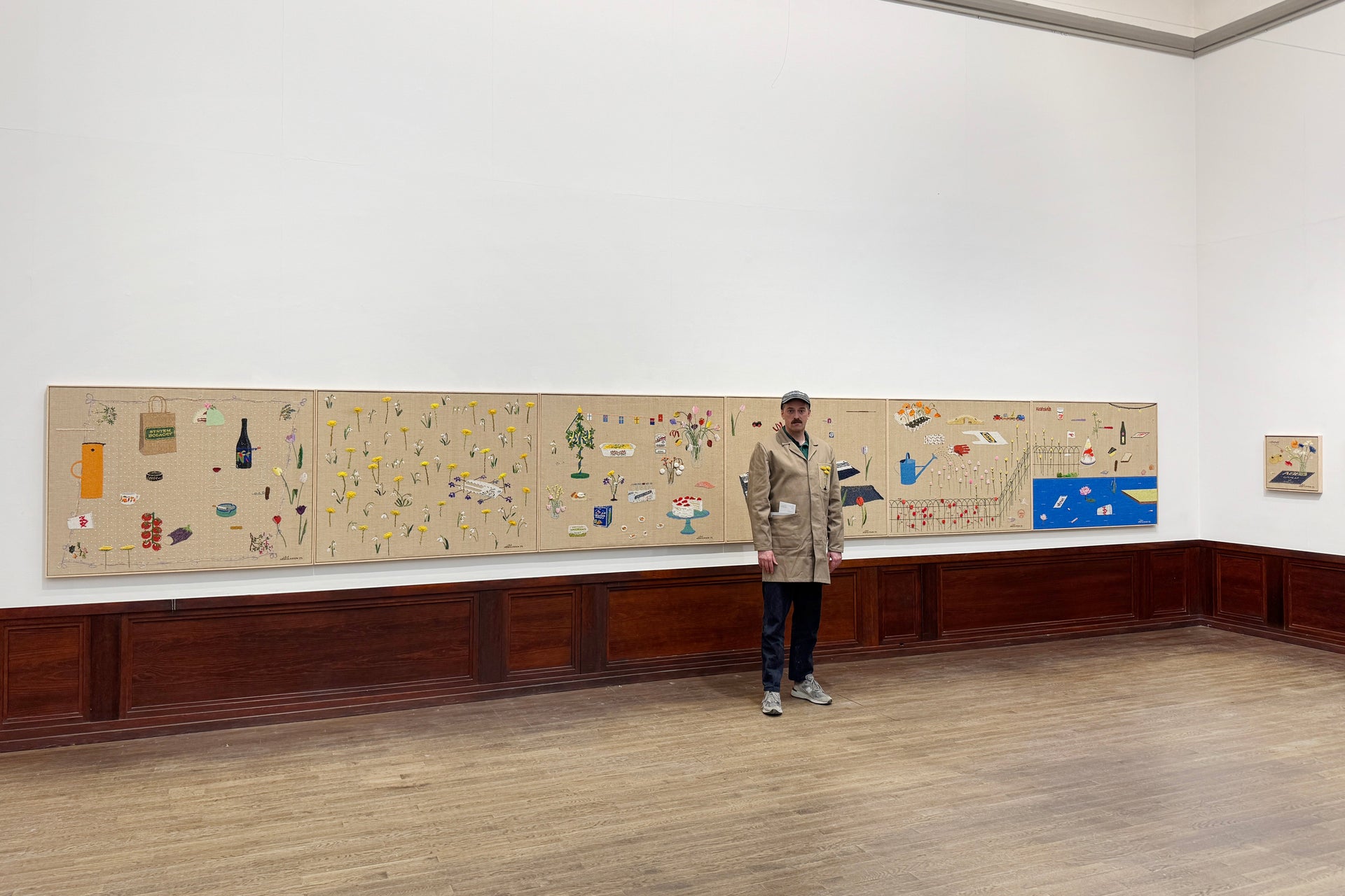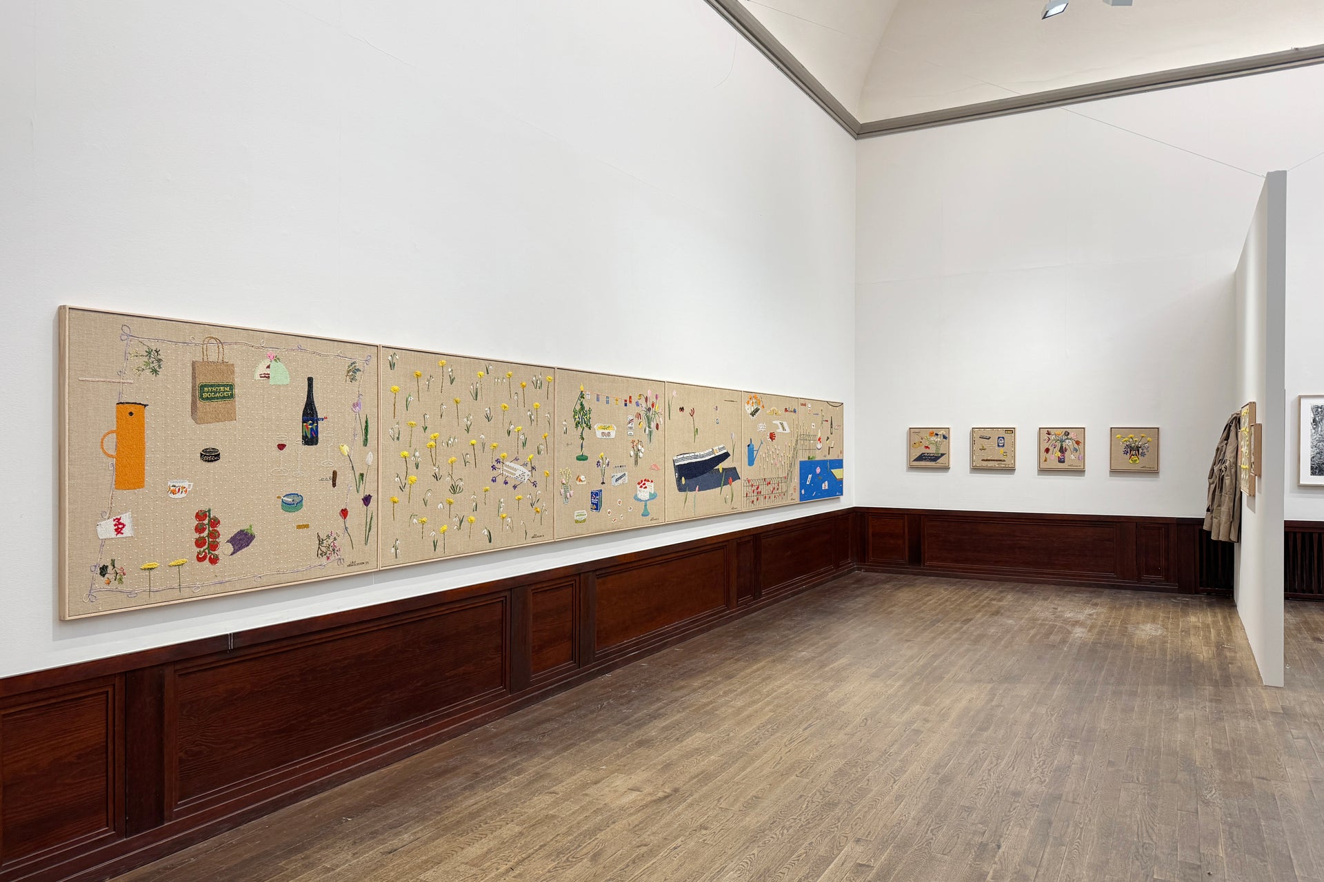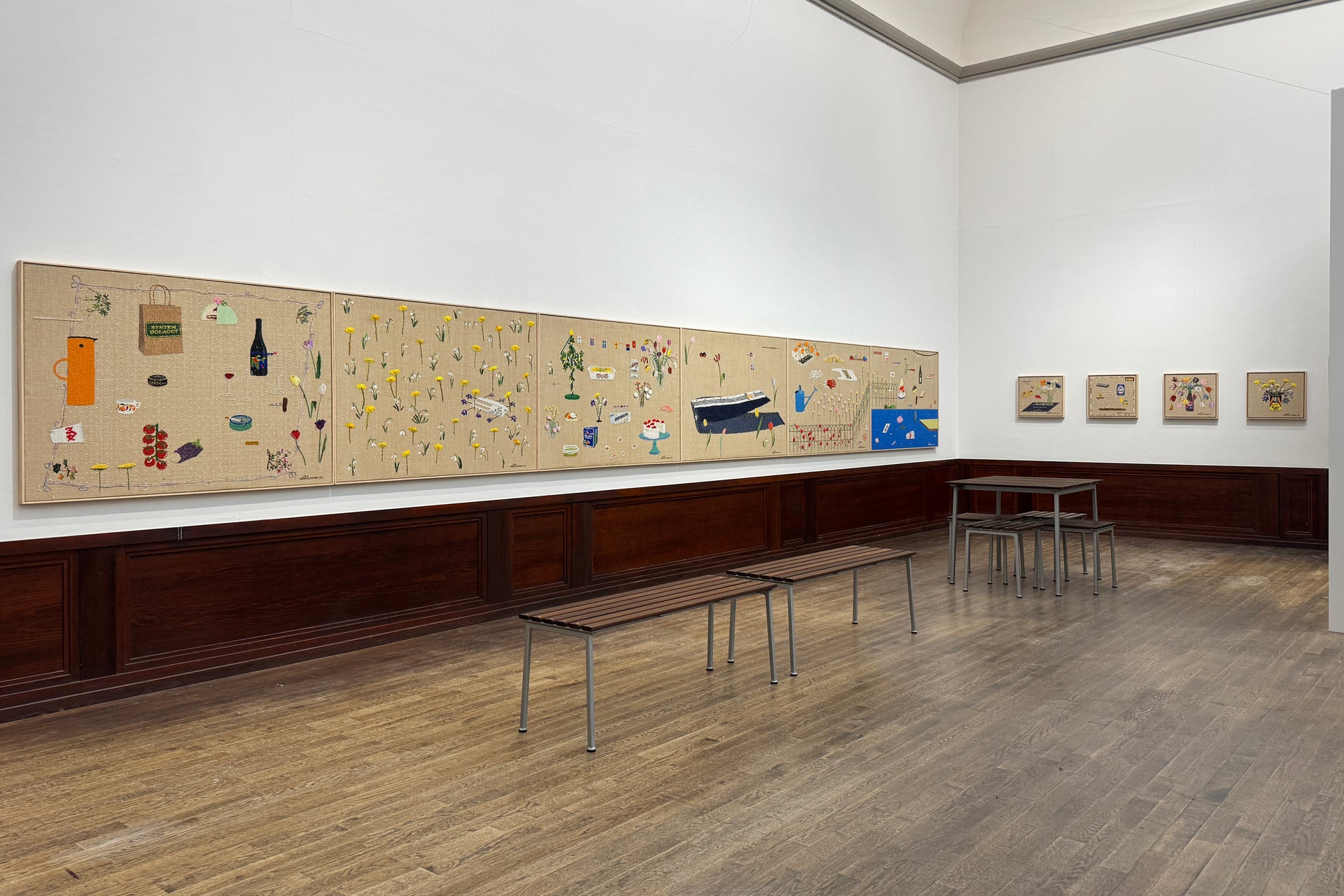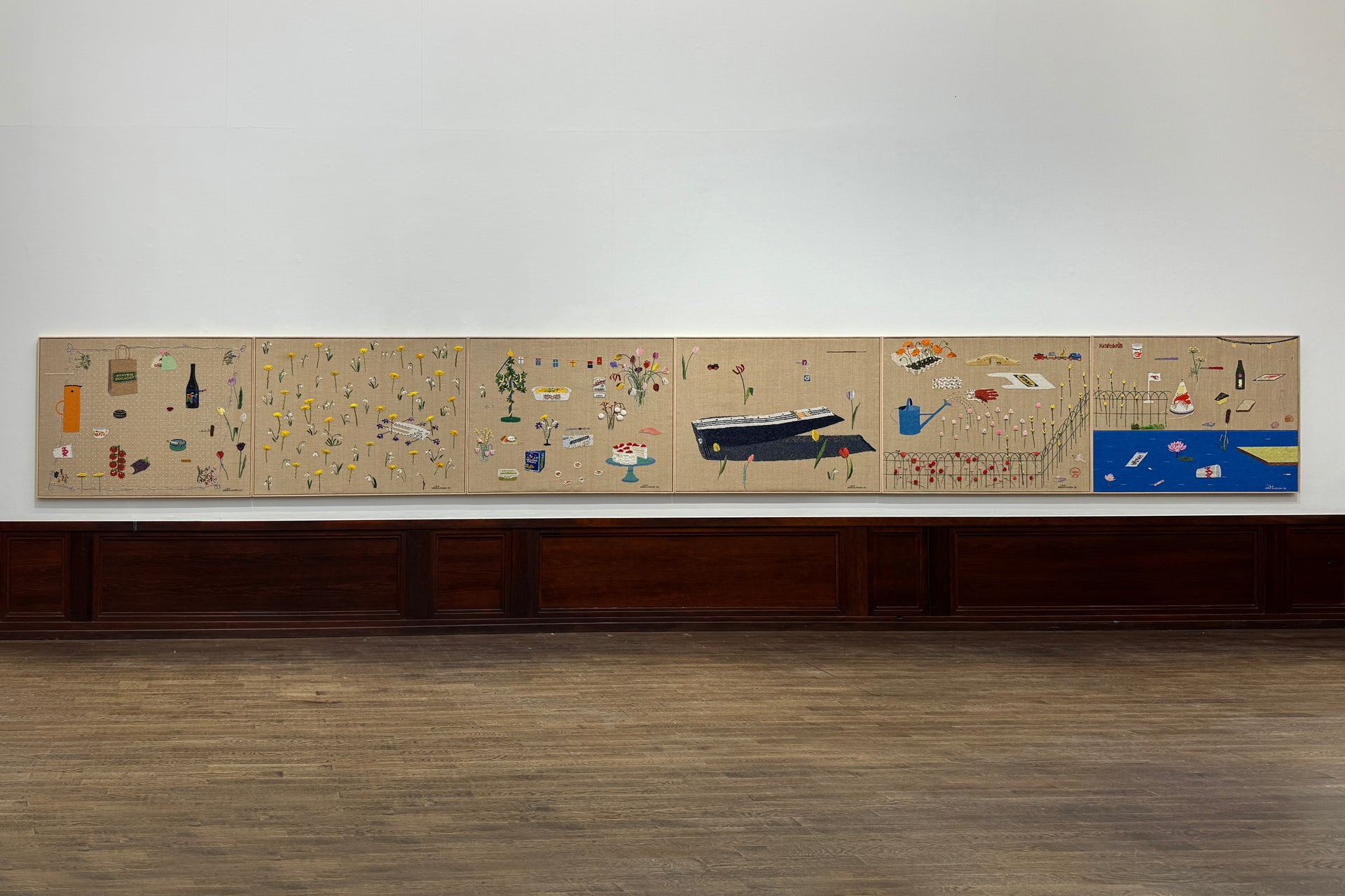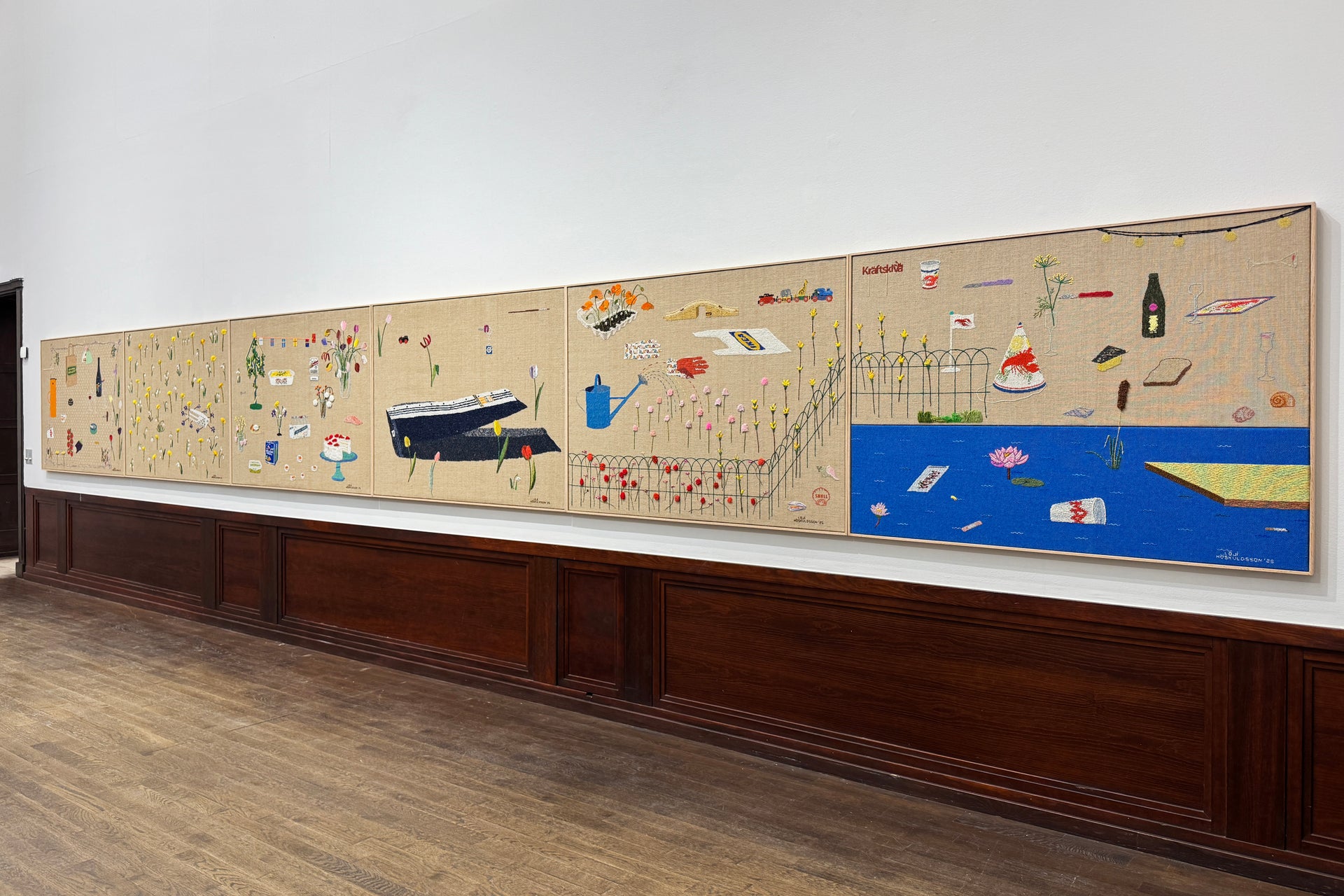Loji Höskuldsson has created his most ambitious work to date—a six-panel embroidery titled 193 Days in Stockholm. The piece documents his experience living in Stockholm over the course of 193 days, weaving in rich references to the Swedish landscape, flora and fauna, regional products, and beloved cultural icons such as midsommarstång, smörgåsbord, Volvo, IKEA, ABBA, and Systembolaget, rendered in Höskuldsson’s signature embroidered style. Taking nearly six months to complete, this monumental work also offers a subtle nod to Monet’s water lilies in the Orangerie. In Höskuldsson’s embroideries, there is a soft hope for humanity on the brink. His works have a disarming way of observing and contemplating our shared existence.