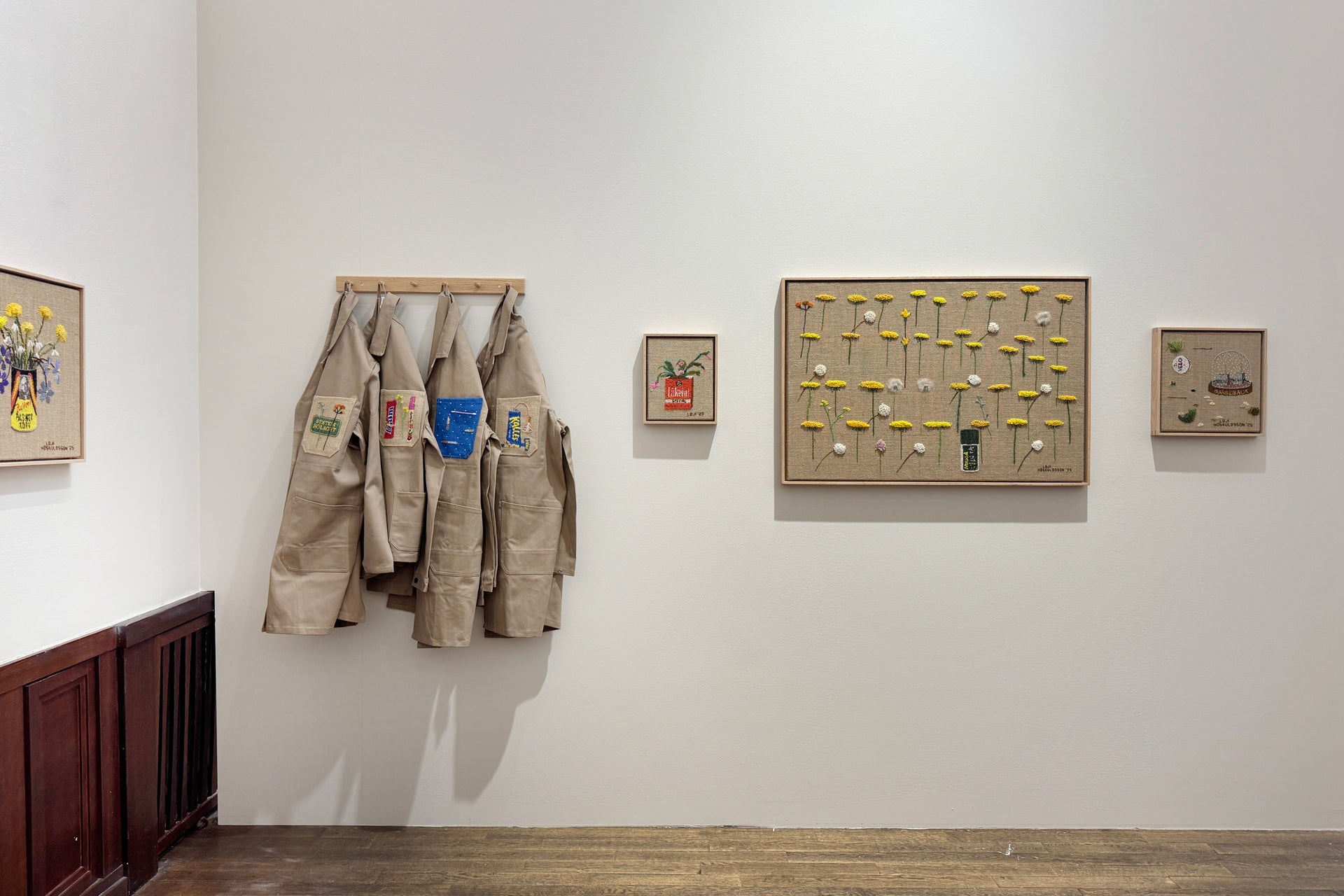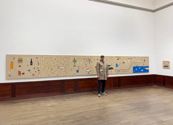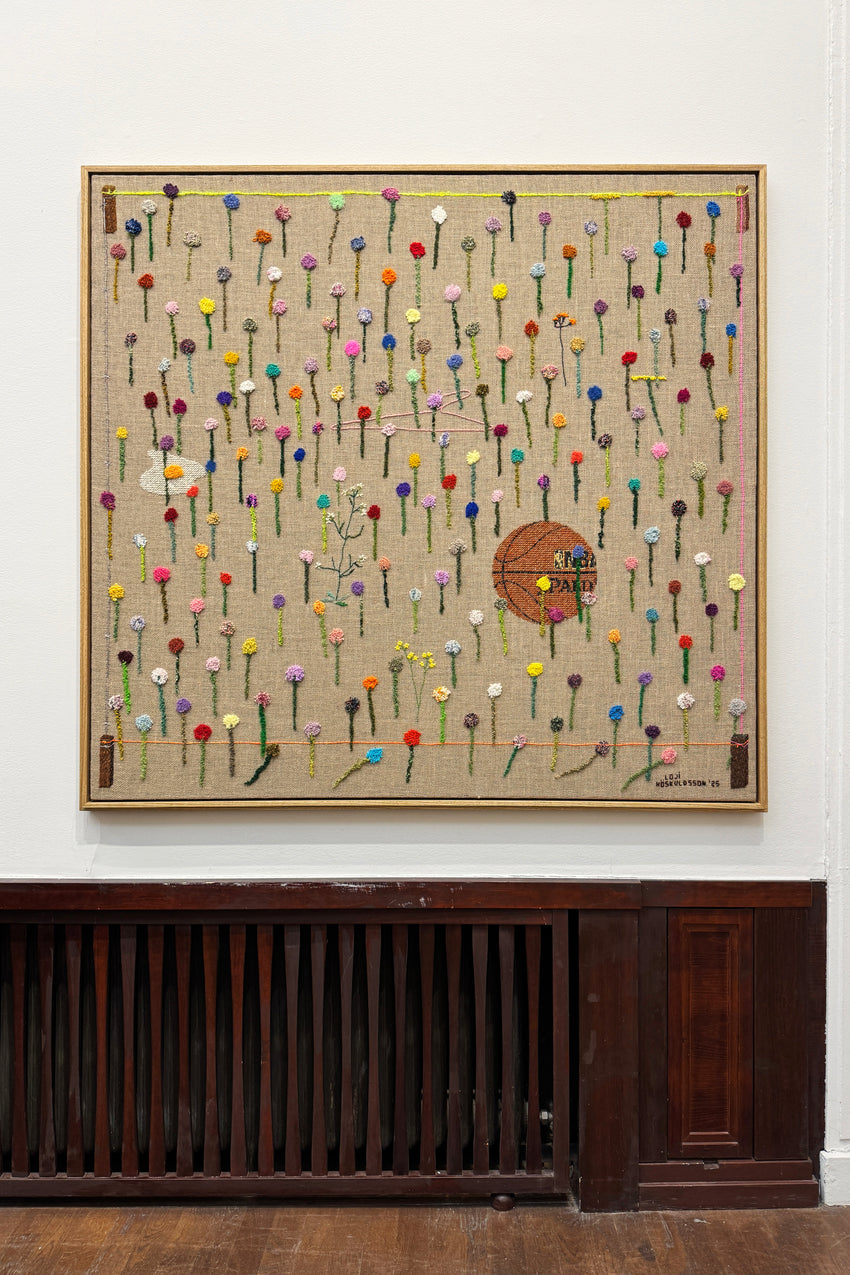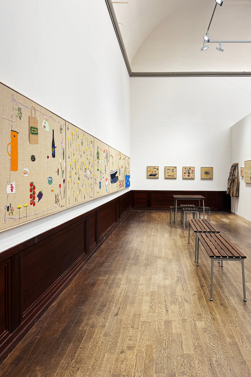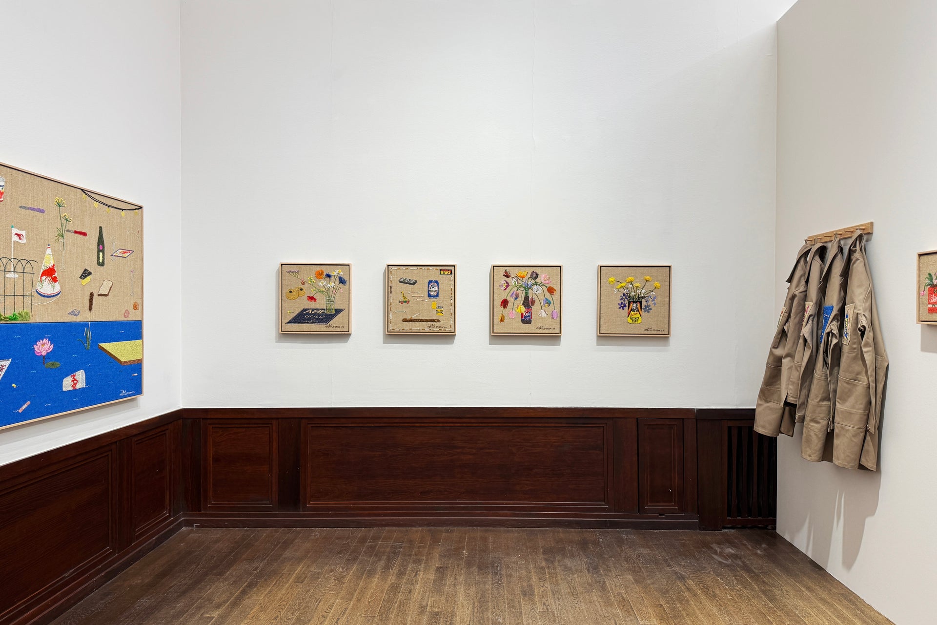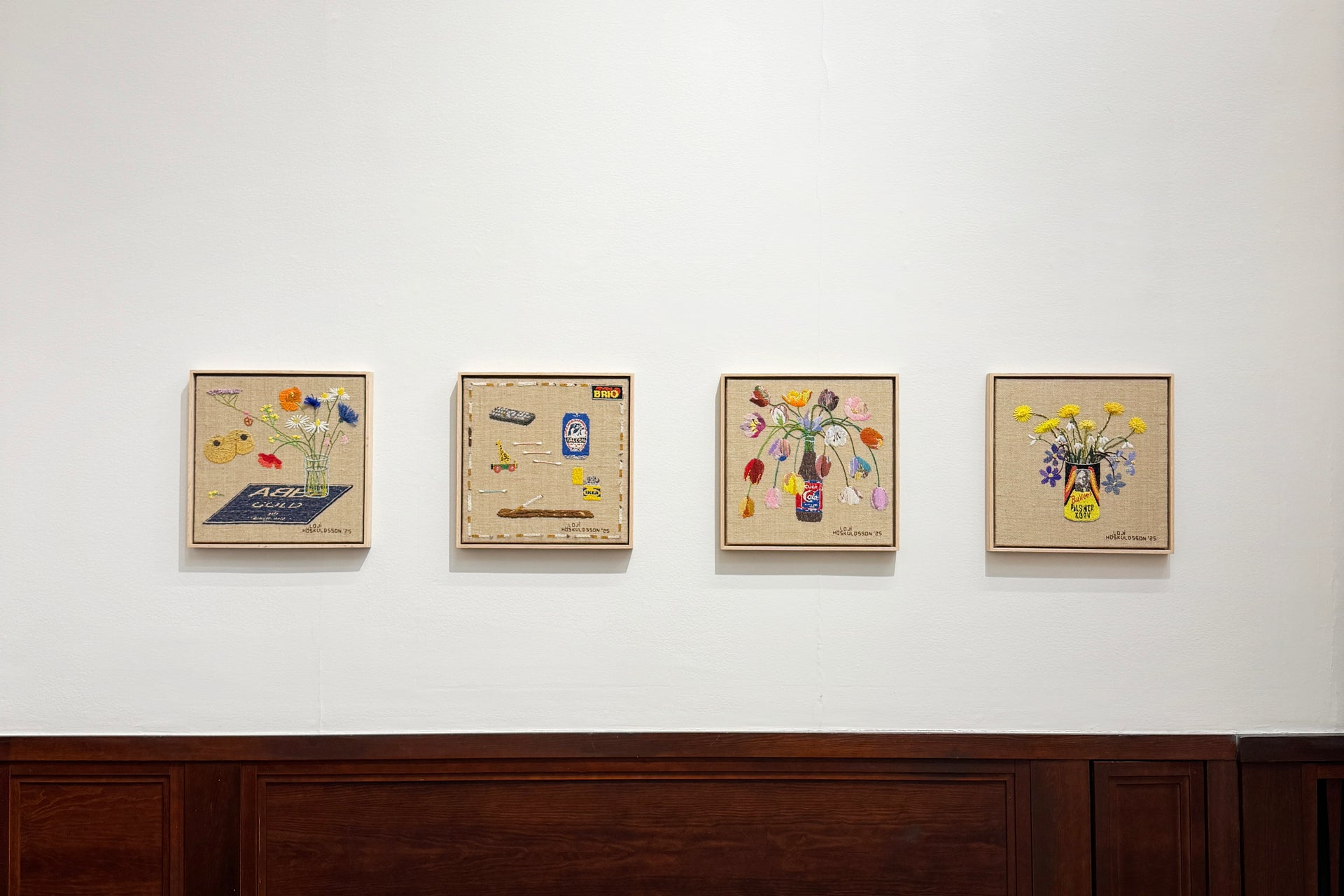 Loji Höskuldsson has created his most ambitious work to date—a six-panel embroidery titled 193 Days in Stockholm. The piece documents his experience living in Stockholm over the course of 193 days, weaving in rich references to the Swedish landscape, flora and fauna, regional products, and beloved cultural icons such as midsommarstång, smörgåsbord, Volvo, IKEA, ABBA, and Systembolaget, rendered in Höskuldsson’s signature embroidered style. Taking nearly six months to complete, this monumental work also offers a subtle nod to Monet’s water lilies in the Orangerie. In Höskuldsson’s embroideries, there is a soft hope for humanity on the brink. His works have a disarming way of observing and contemplating our shared existence.