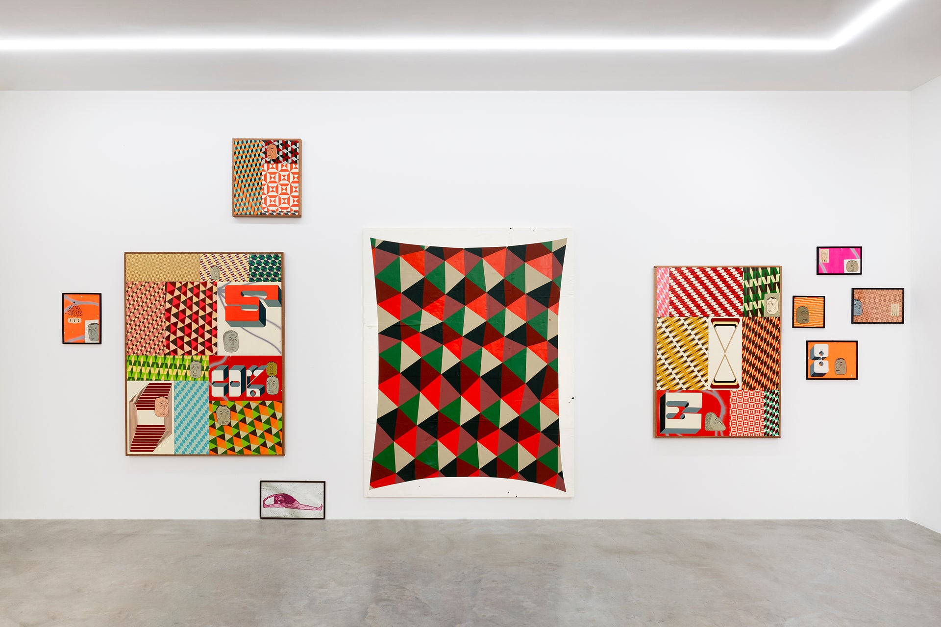 Barry McGee, born 1966, lives and works on the American West Coast in San Francisco. Working in a wide variety of media that includes painting on wood, ceramics, drawing, zines, photography, sculpture, and large-scale installation, McGee refuses hierarchies of material or subject matter and treats all formats equally. His artistic style incorporates a multitude of inspirations: American folk art, sign-making, Op Art, and graffiti. McGee’s work is influenced by and reflects upon contemporary society, especially those who tend to be left behind by it, or choose not to play by its rules. In this recent body of work, the artist pushes his imagery into the iconic; figures and shapes are barely indicated, then repeated and mixed with abstract patterns.