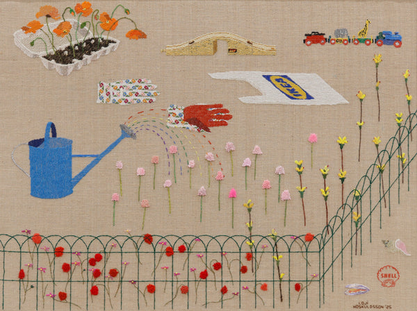 Loji Höskuldsson has created his most ambitious work to date—a six-panel embroidery titled 193 Days in Stockholm. The piece documents his experience living in Stockholm over the course of 193 days, weaving in rich references to the Swedish landscape, flora and fauna, regional products, and beloved cultural icons such as midsommarstång, smörgåsbord, Volvo, IKEA, ABBA, and Systembolaget, rendered in Höskuldsson’s signature embroidered style. Taking nearly six months to complete, this monumental work also offers a subtle nod to Monet’s water lilies in the Orangerie. In Höskuldsson’s embroideries, there is a soft hope for humanity on the brink. His works have a disarming way of observing and contemplating our shared existence.